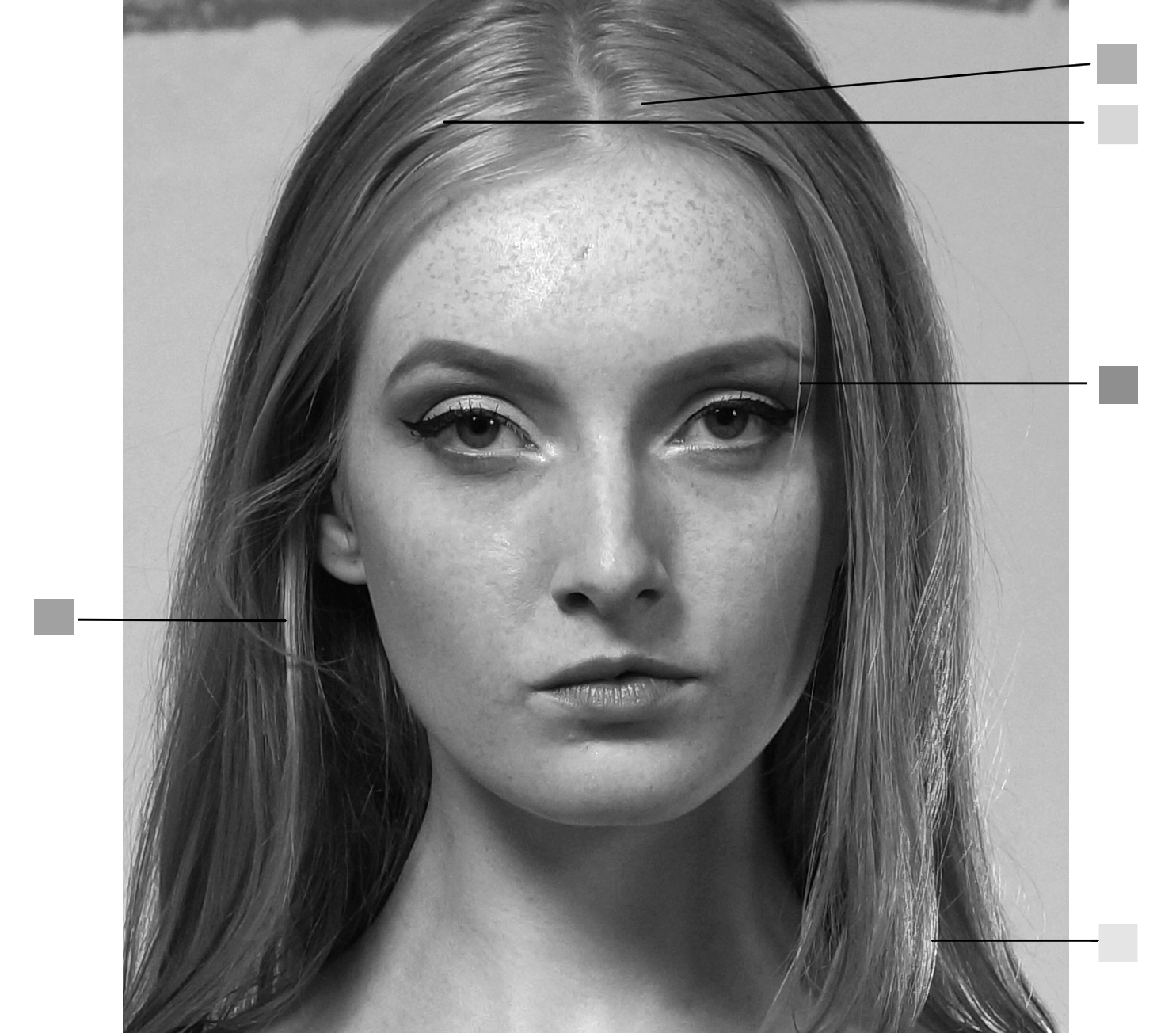Although in shadow, the hair is still perceived as very bright—or even white but the real tones are different. As the example below shows, even what we see as the brightest parts of the hair are rarely pure white. They are usually subtle variations of light to medium grey.